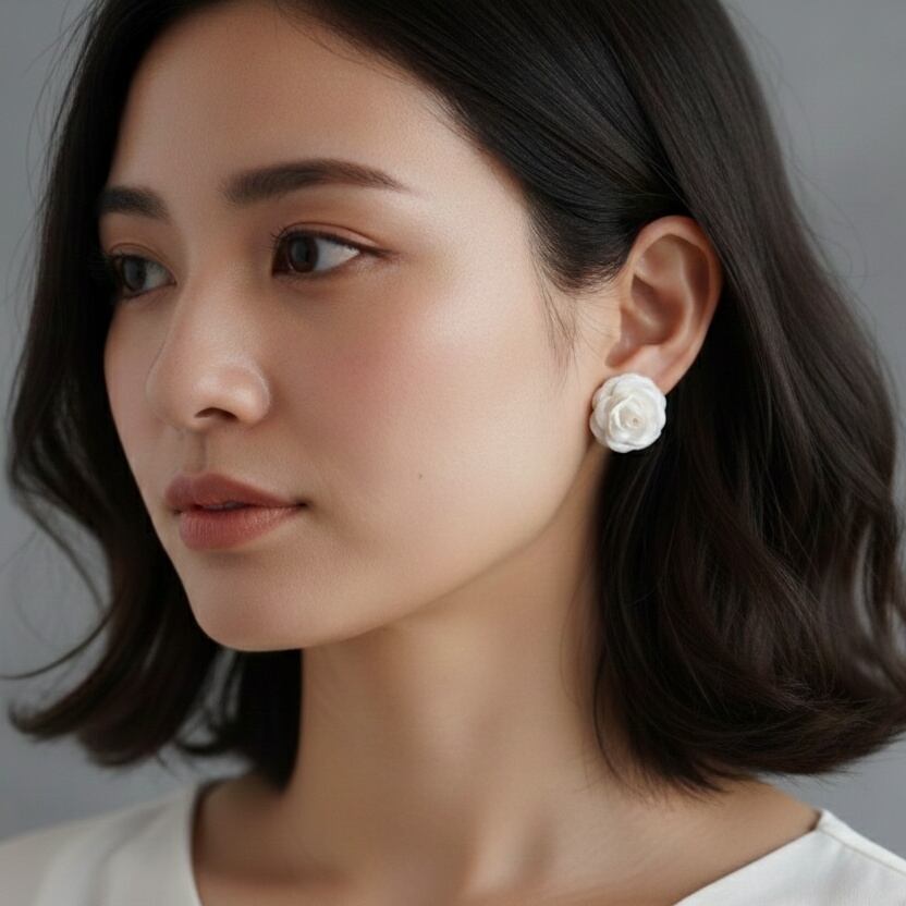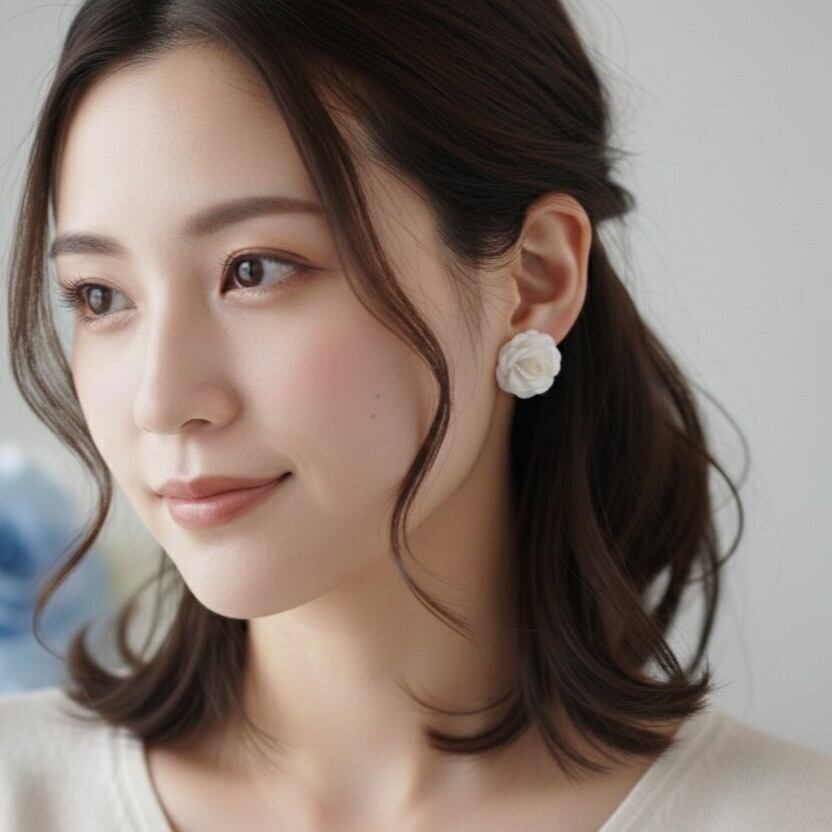 清らかな白いバラをモチーフにしたエレガントなイヤリング/ピアスです。お花の部分は紙で作られており、軽やかな着け心地が魅力。ホワイトローズの花言葉は「純潔」や「愛」、その美しさが装いにさらなる輝きを添えます。