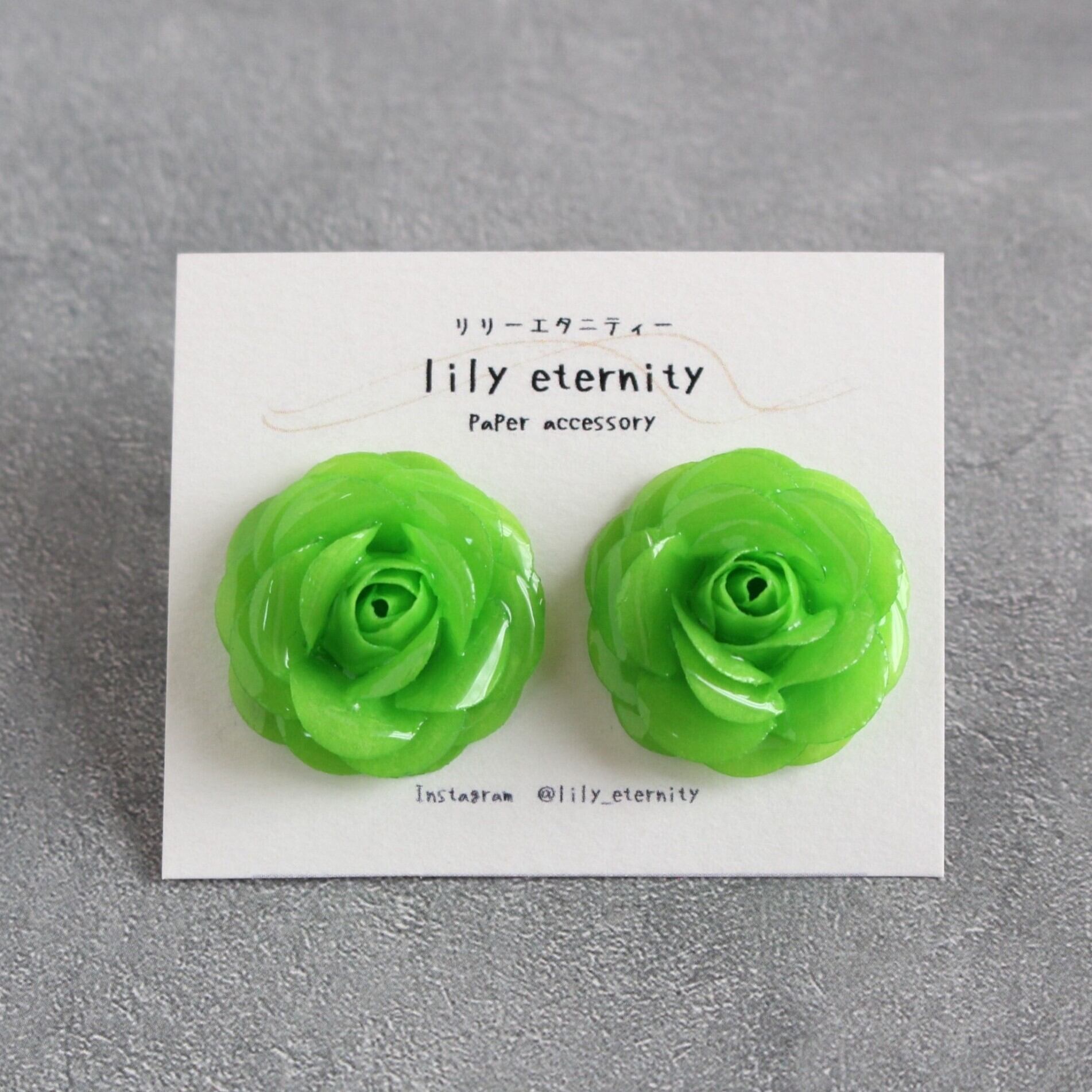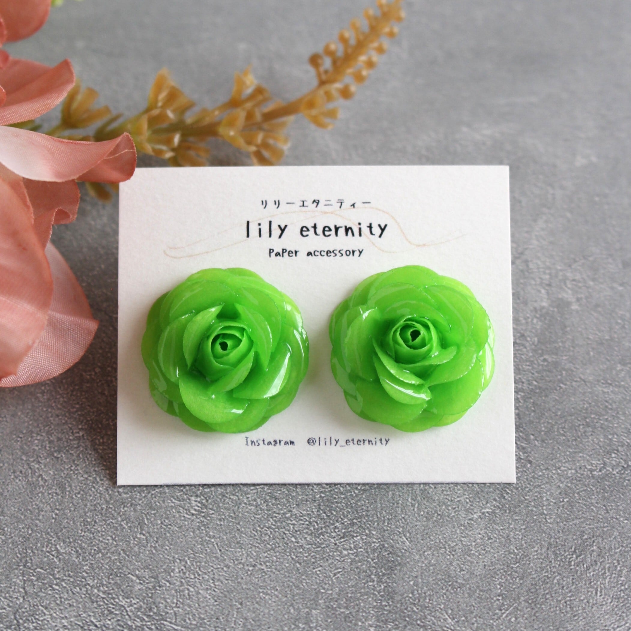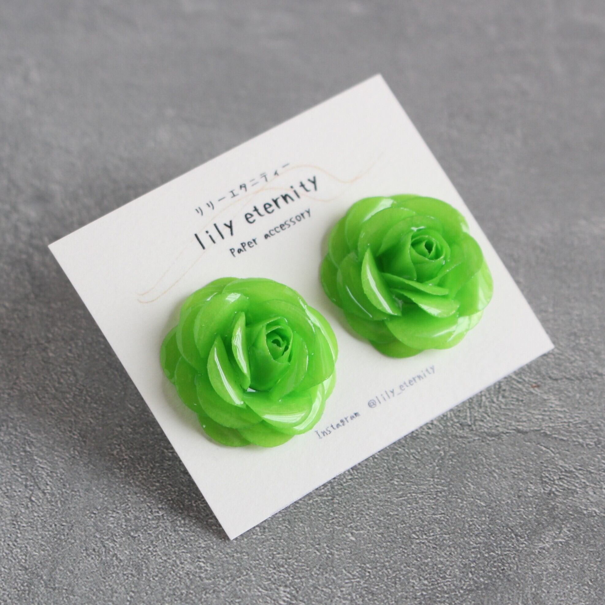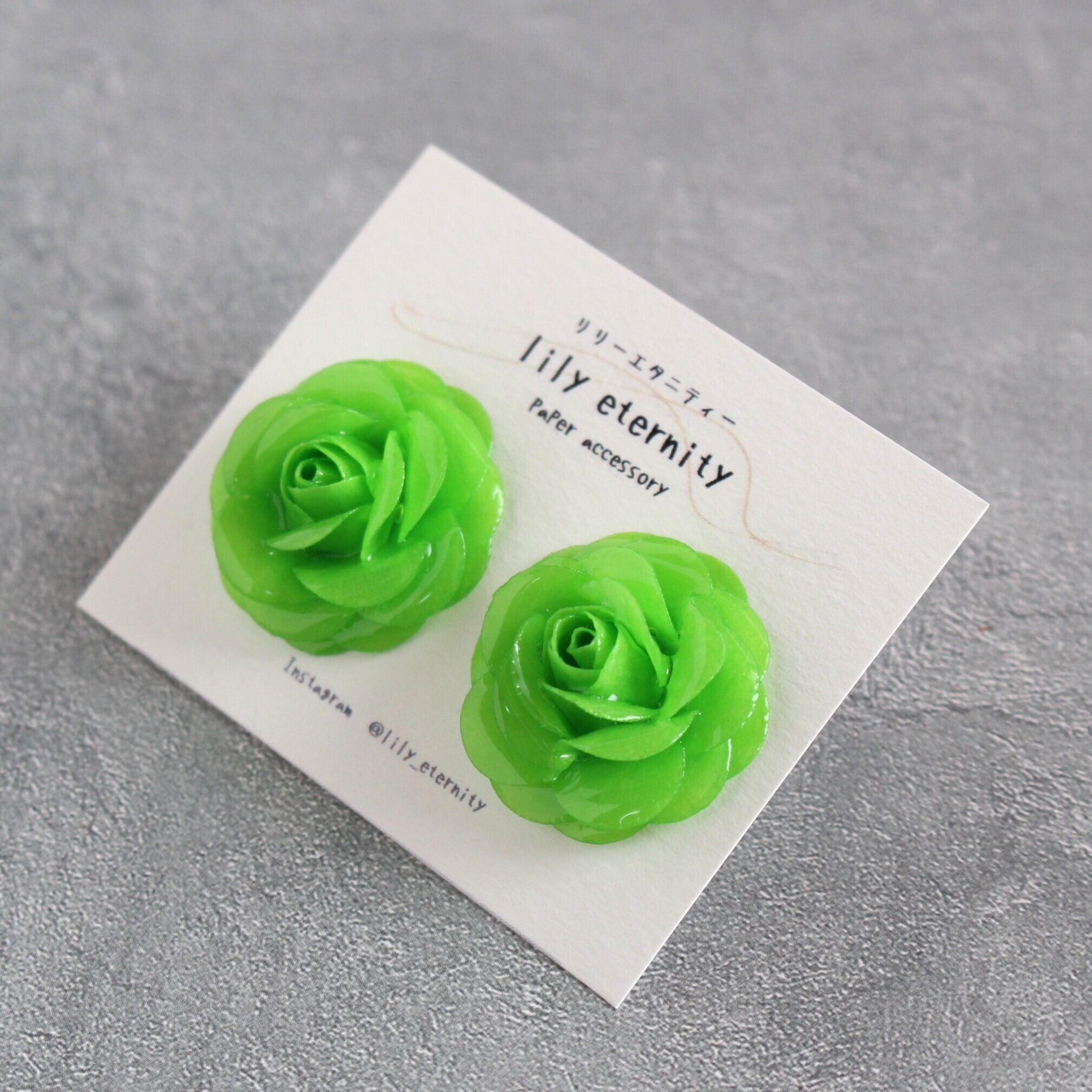 鮮やかなグリーンのバラをモチーフにしたイヤリング/ピアスです。お花の部分は紙で丁寧に作っており、「これが紙?」と驚かれるほどの瑞々しい艶、そして軽やかで心地よい着用感が魅力。花言葉は「穏やか」「癒やし」「希望」。美しいグリーンが装いに新たなエネルギーを添えます。
