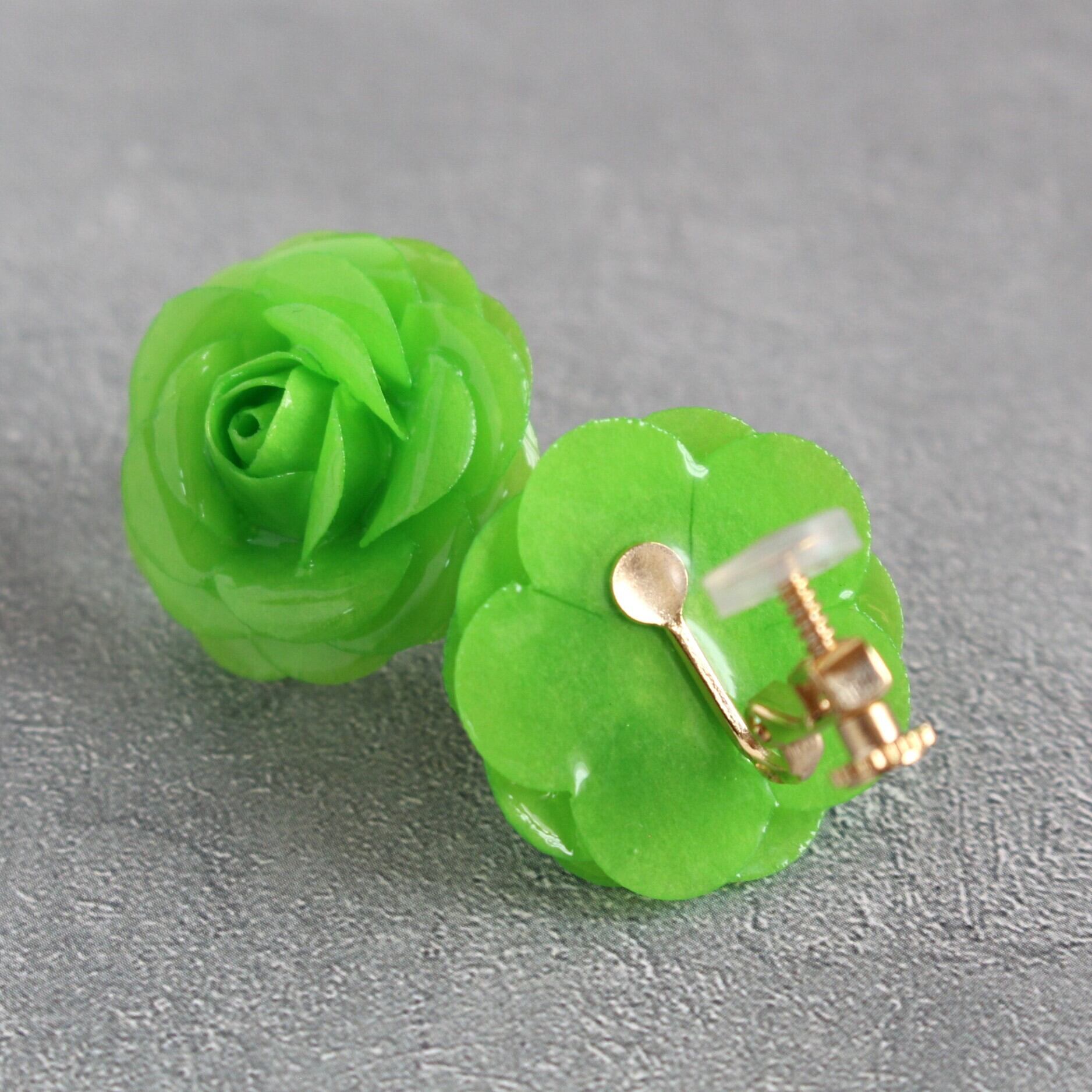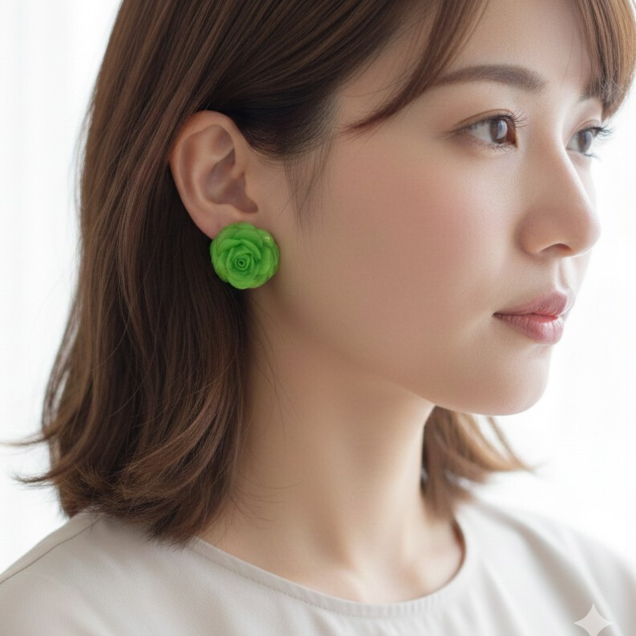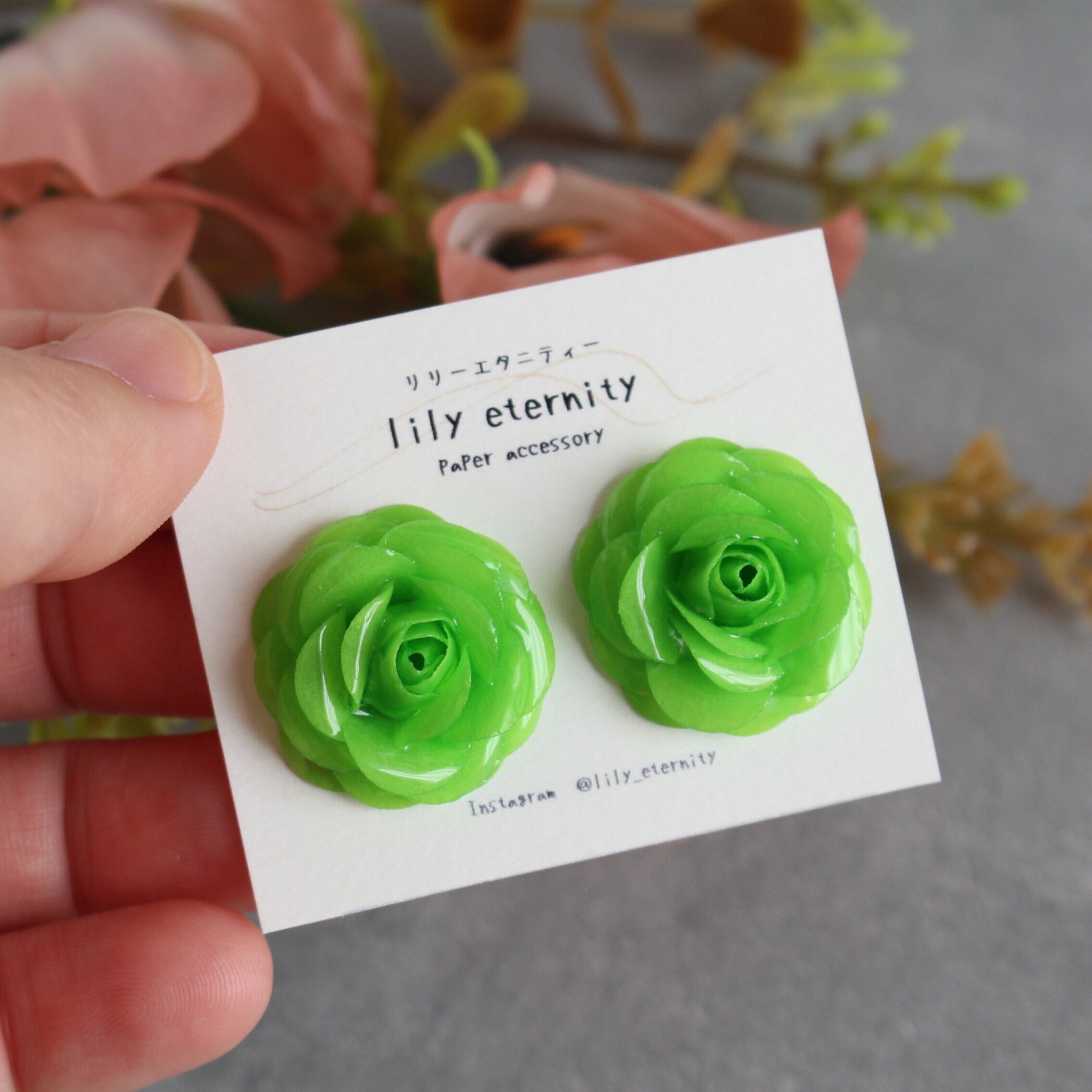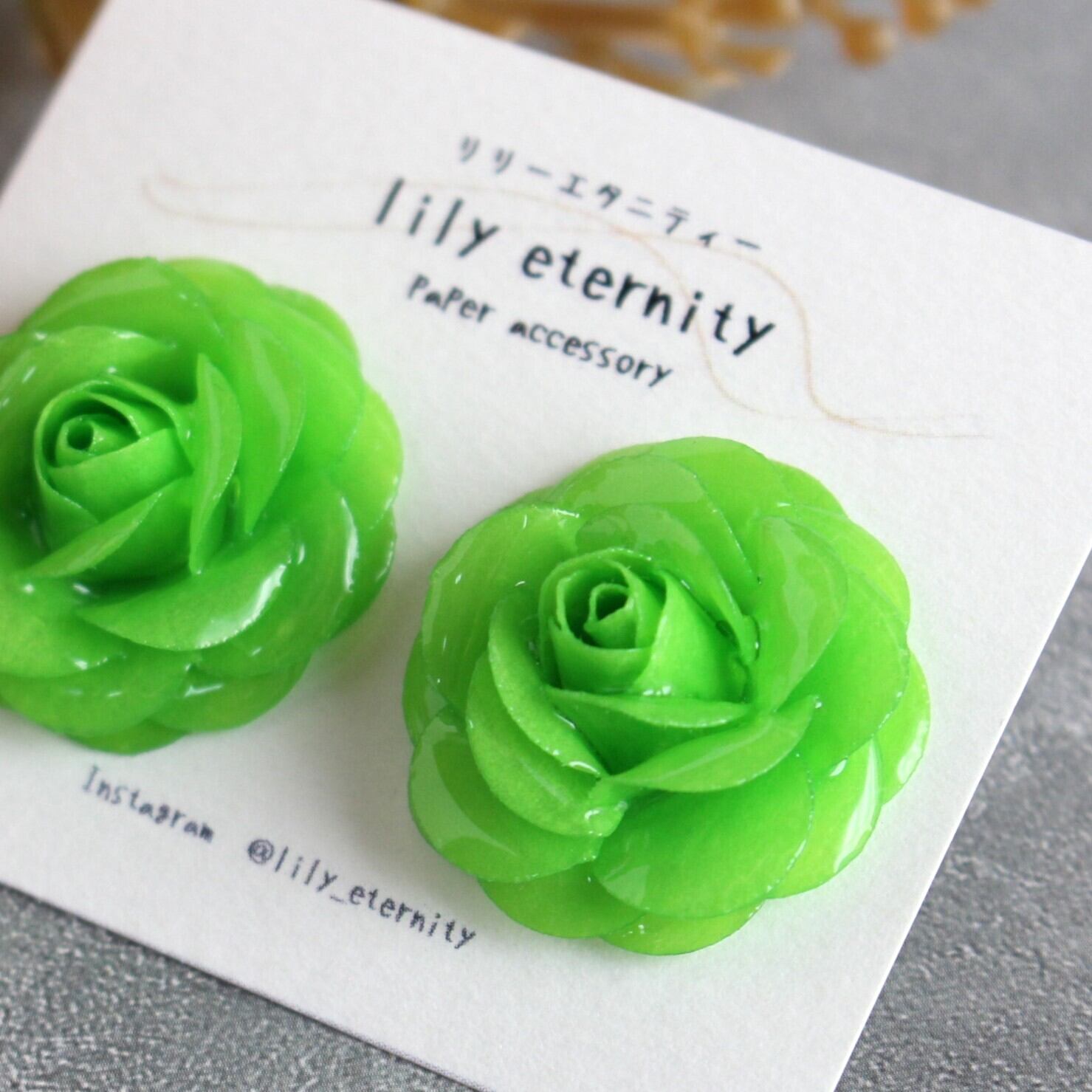 鮮やかなグリーンのバラをモチーフにしたイヤリング/ピアスです。お花の部分は紙で丁寧に作っており、「これが紙?」と驚かれるほどの瑞々しい艶、そして軽やかで心地よい着用感が魅力。花言葉は「穏やか」「癒やし」「希望」。美しいグリーンが装いに新たなエネルギーを添えます。