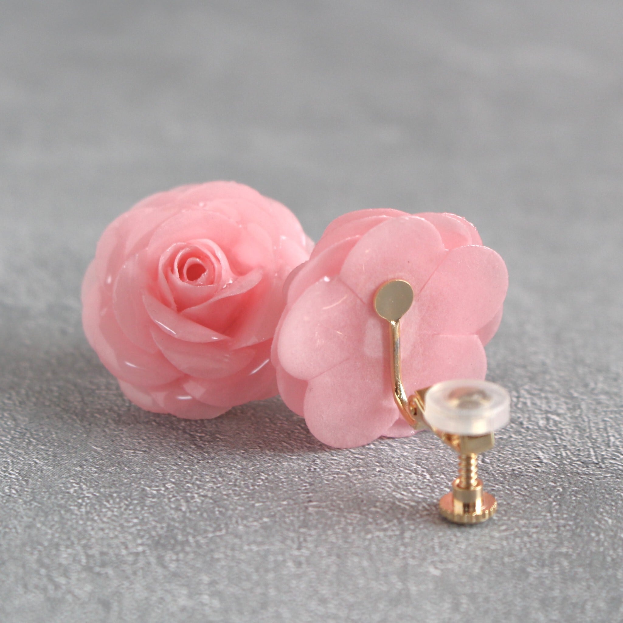 花びらの重なりや丸みは、本物のバラのような立体感を大切にしています。やわらかなピンクは顔まわりをふんわりと明るく見せてくれます。さりげなくフェミニンさを添えたい方へ。