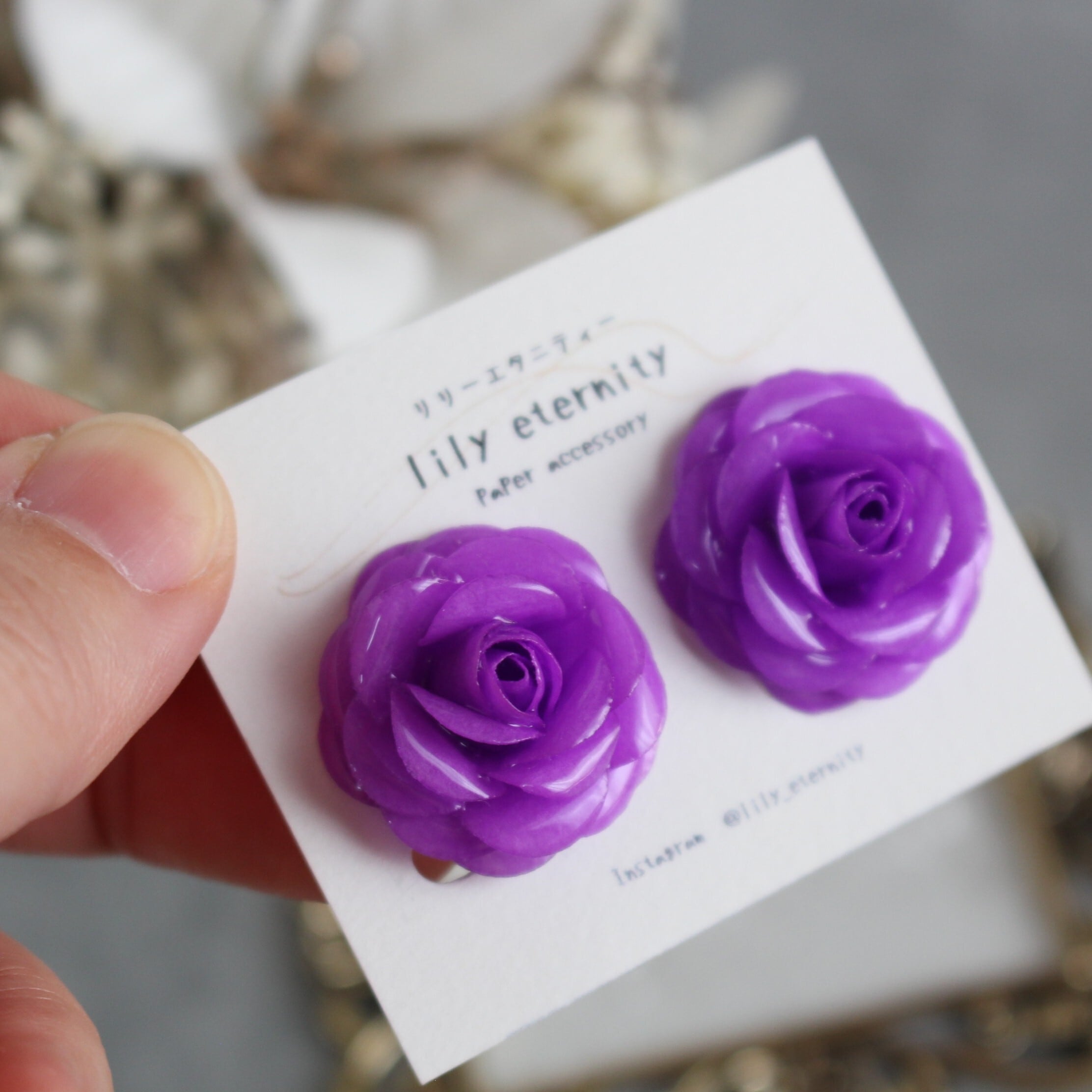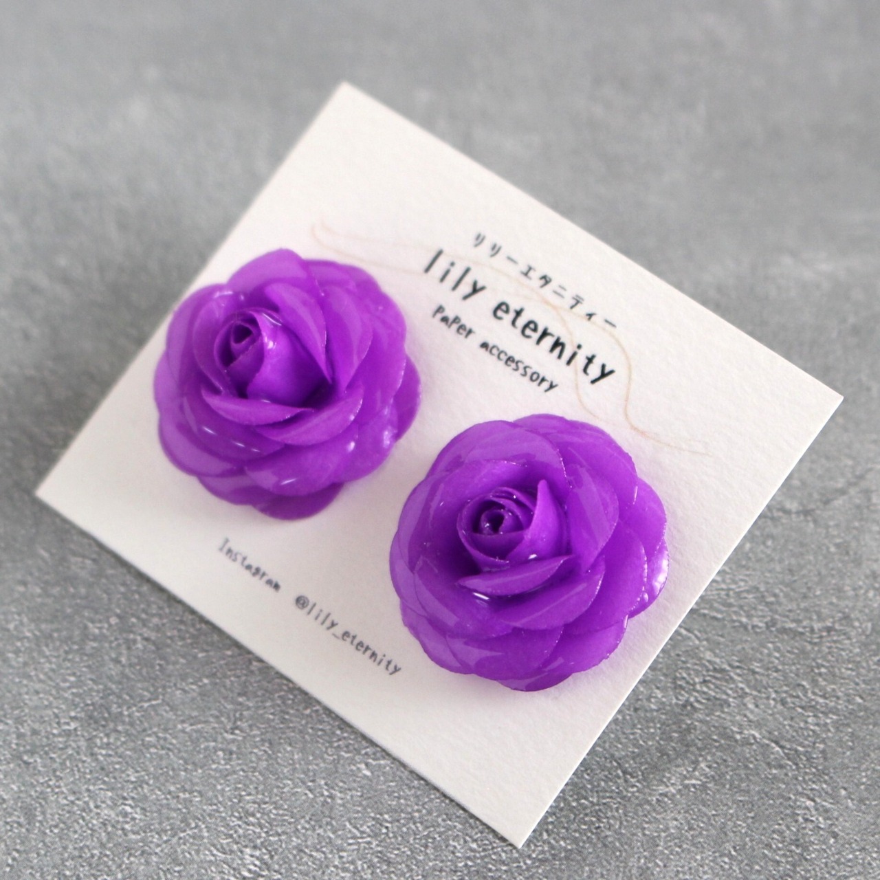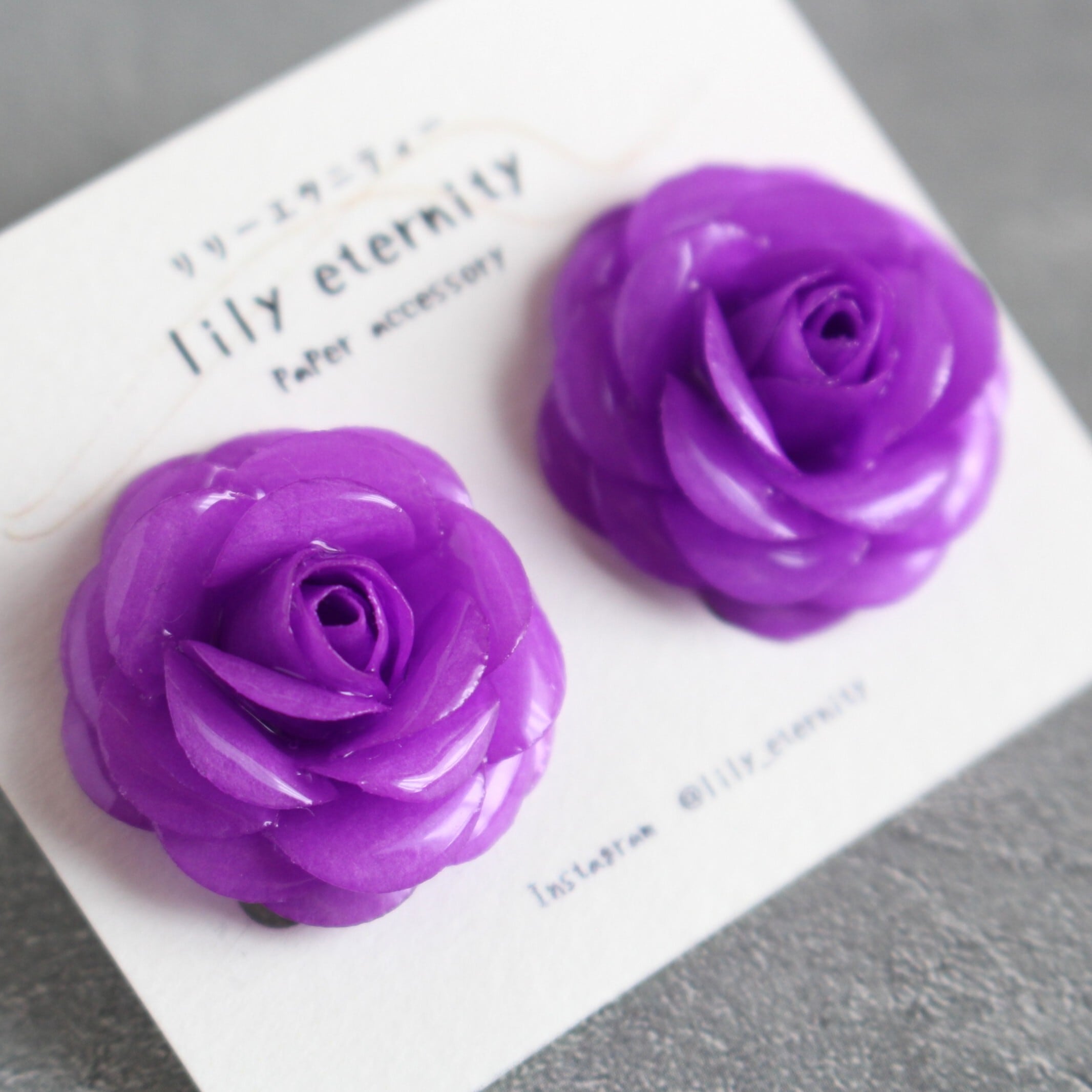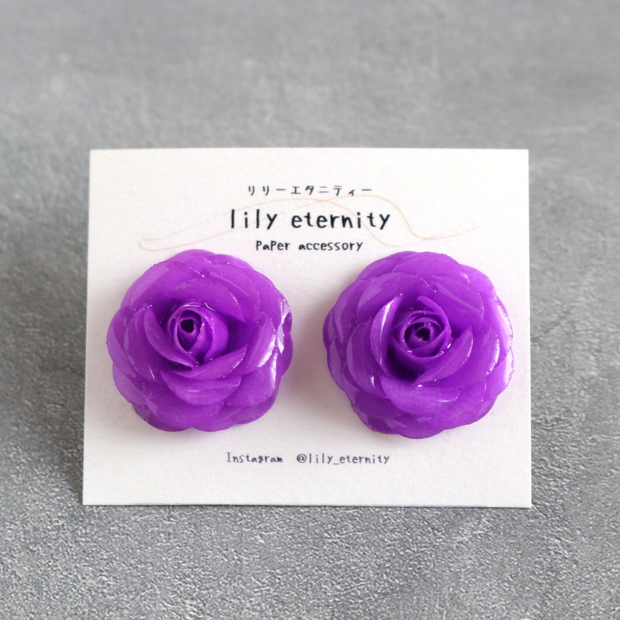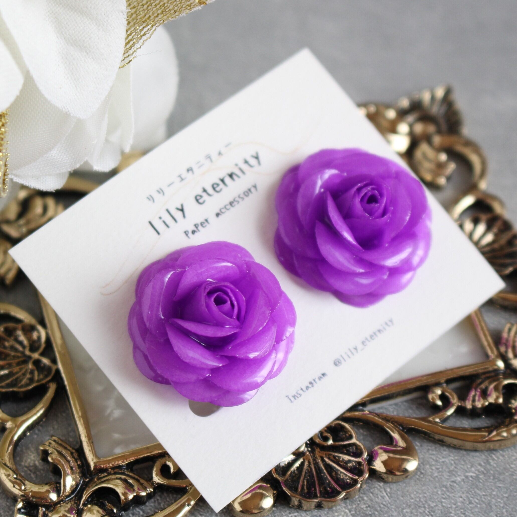 優雅な紫色のバラをあしらったイヤリング/ピアスです。お花部分は紙で作っており、軽やかな着け心地が特徴。気品に満ちたデザインは、どんなシーンでも美しく映えます。ハンドメイドのため、ひとつひとつ異なる花びらの表情を楽しむことができ、個性を引き立てます。