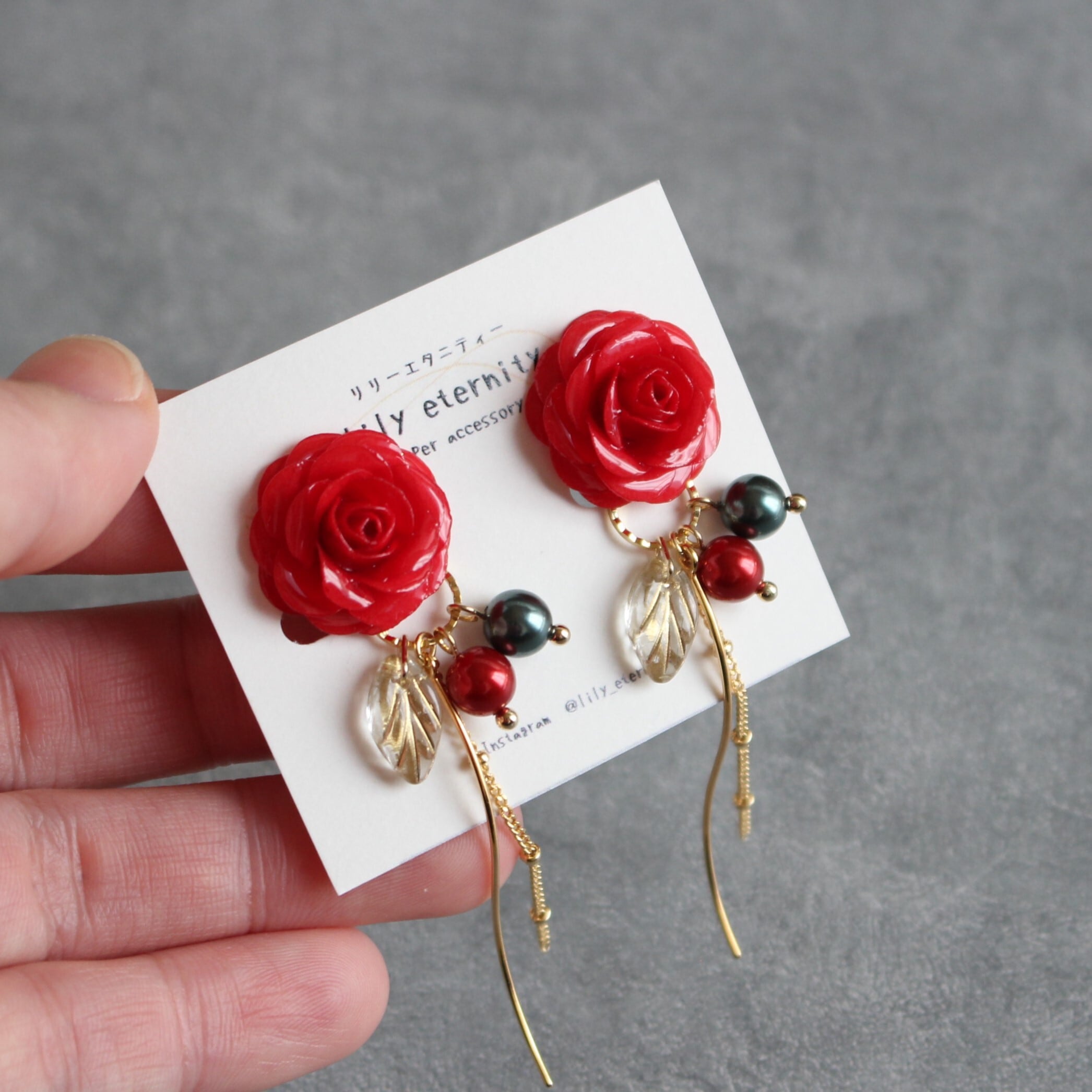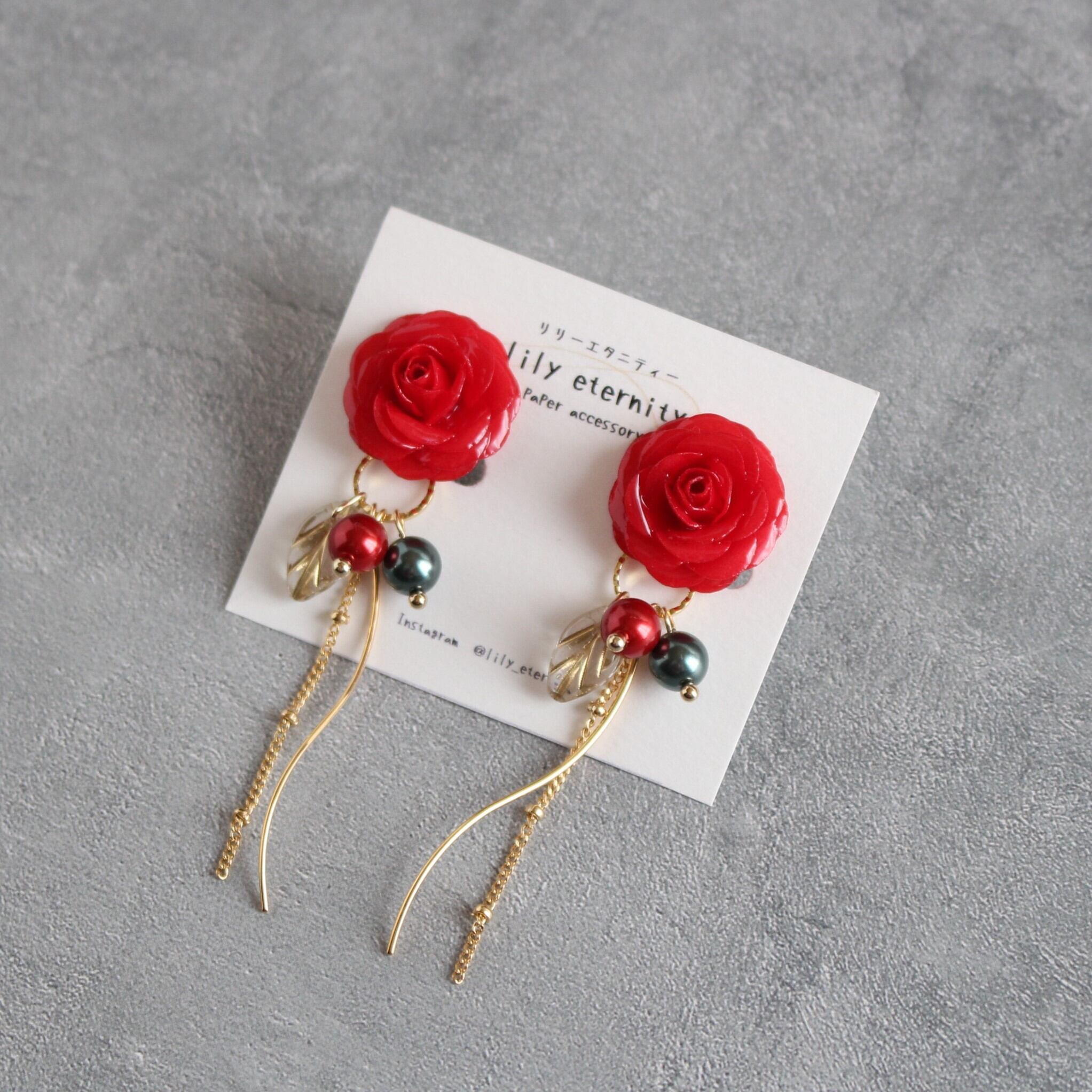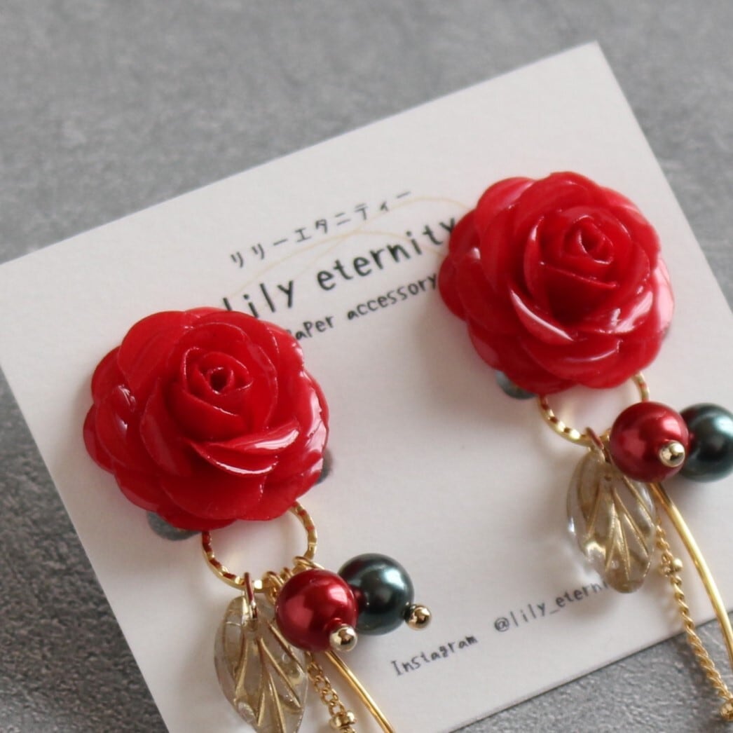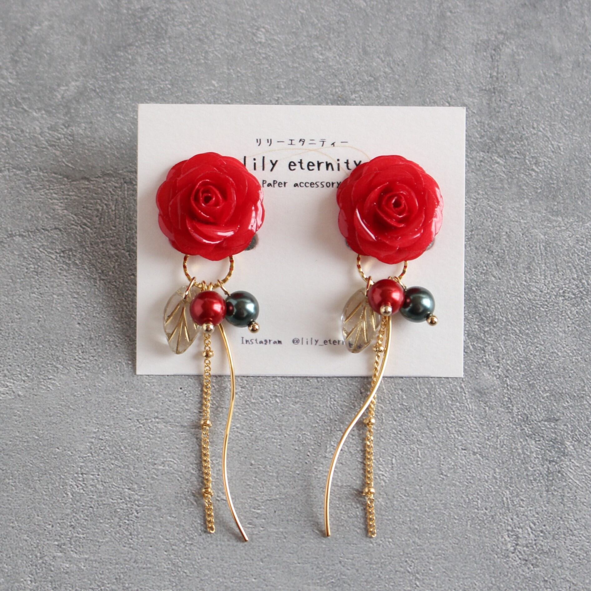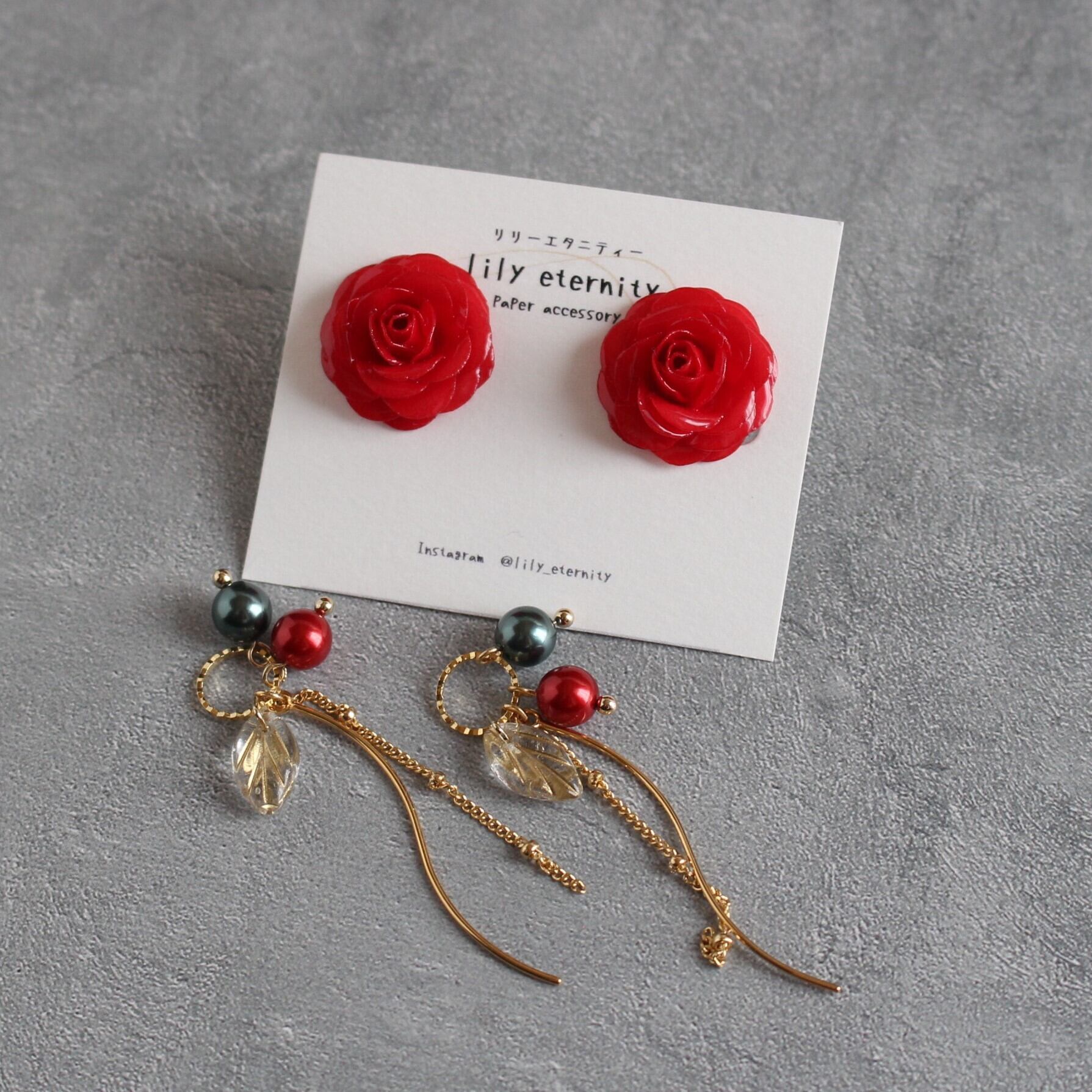 華やかな薔薇とカラーパールを組み合わせたイヤリングです。お花部分は紙でできており、軽やかな着け心地が特徴です。落ち着きのある色味の赤と緑のパールを使用しています。ひとつひとつ丁寧に作っており、個性豊かな表情を楽しめるアイテムとなっています。